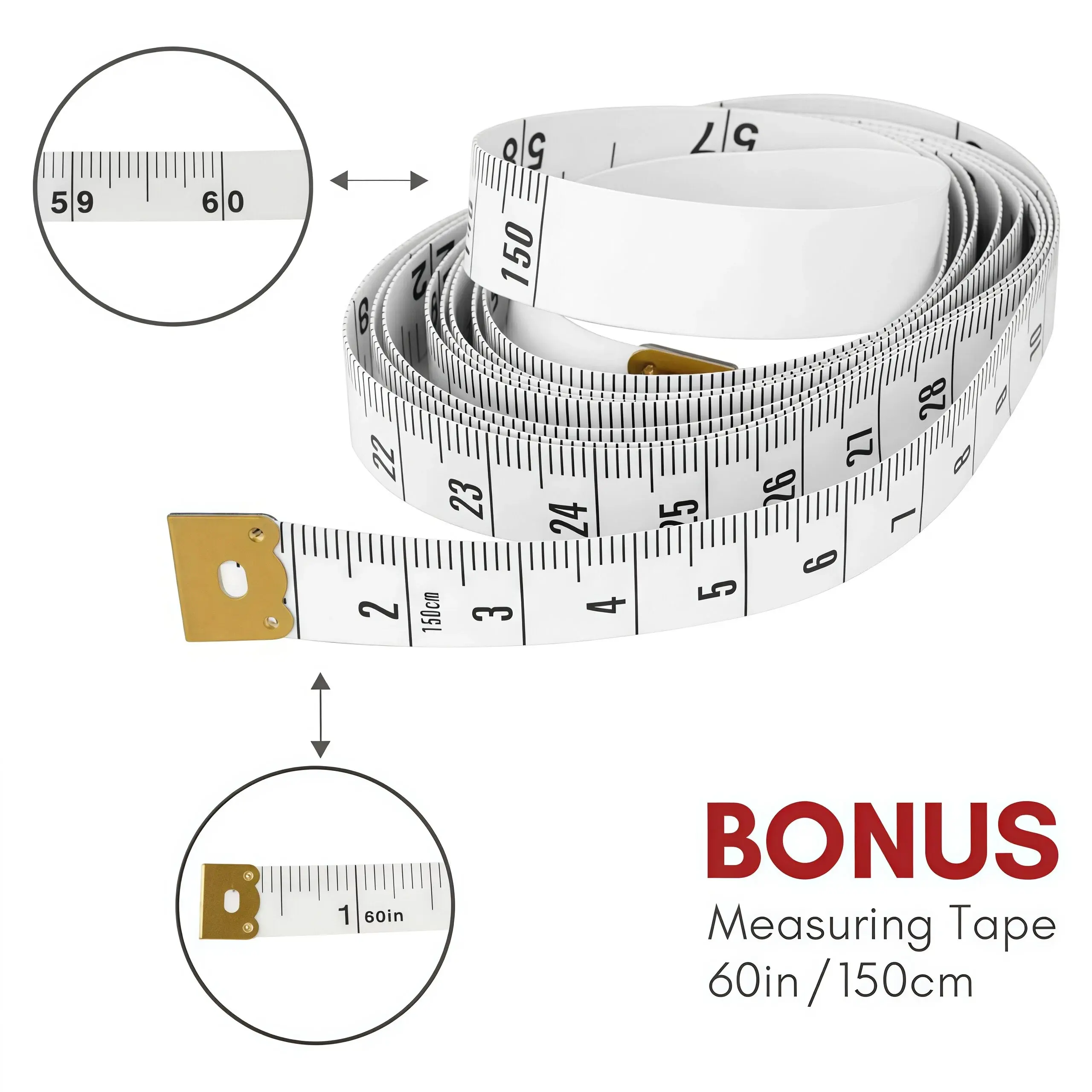 - BONUS MEASURING TAPE: Flexible and portable measuring tape, made from soft plastic material, white color, suitable for measuring curved or flat surfaces, dual sided to show inches and centimeters, measuring range is 60 inches / 150cm.