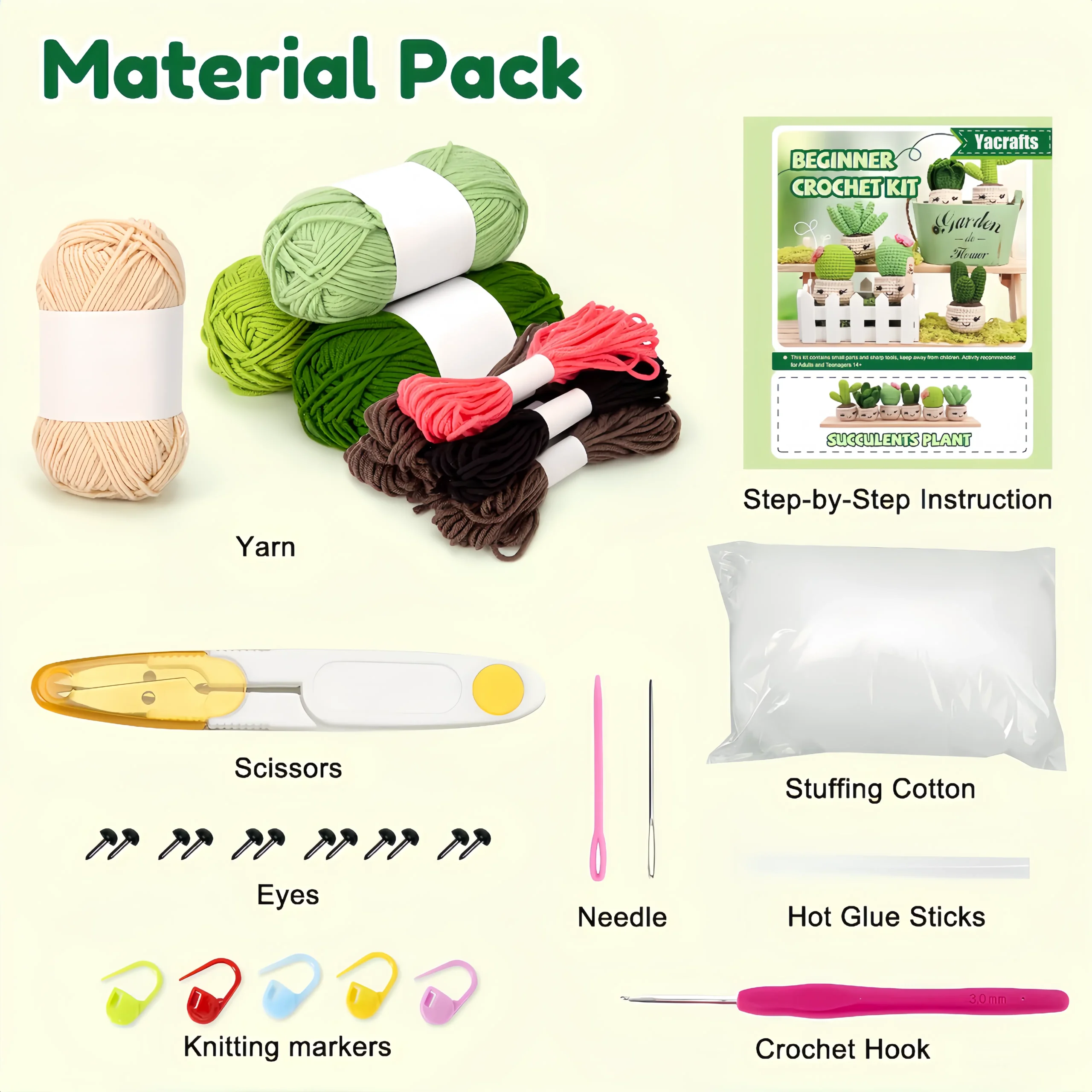| Included Components | Enough yarns, 1 x crochet hook, 1 x stuffing, 1 x scissors, 2 x needles, 5 x stitch markers, 12 x eyes, 1 x instruction crochet kit |