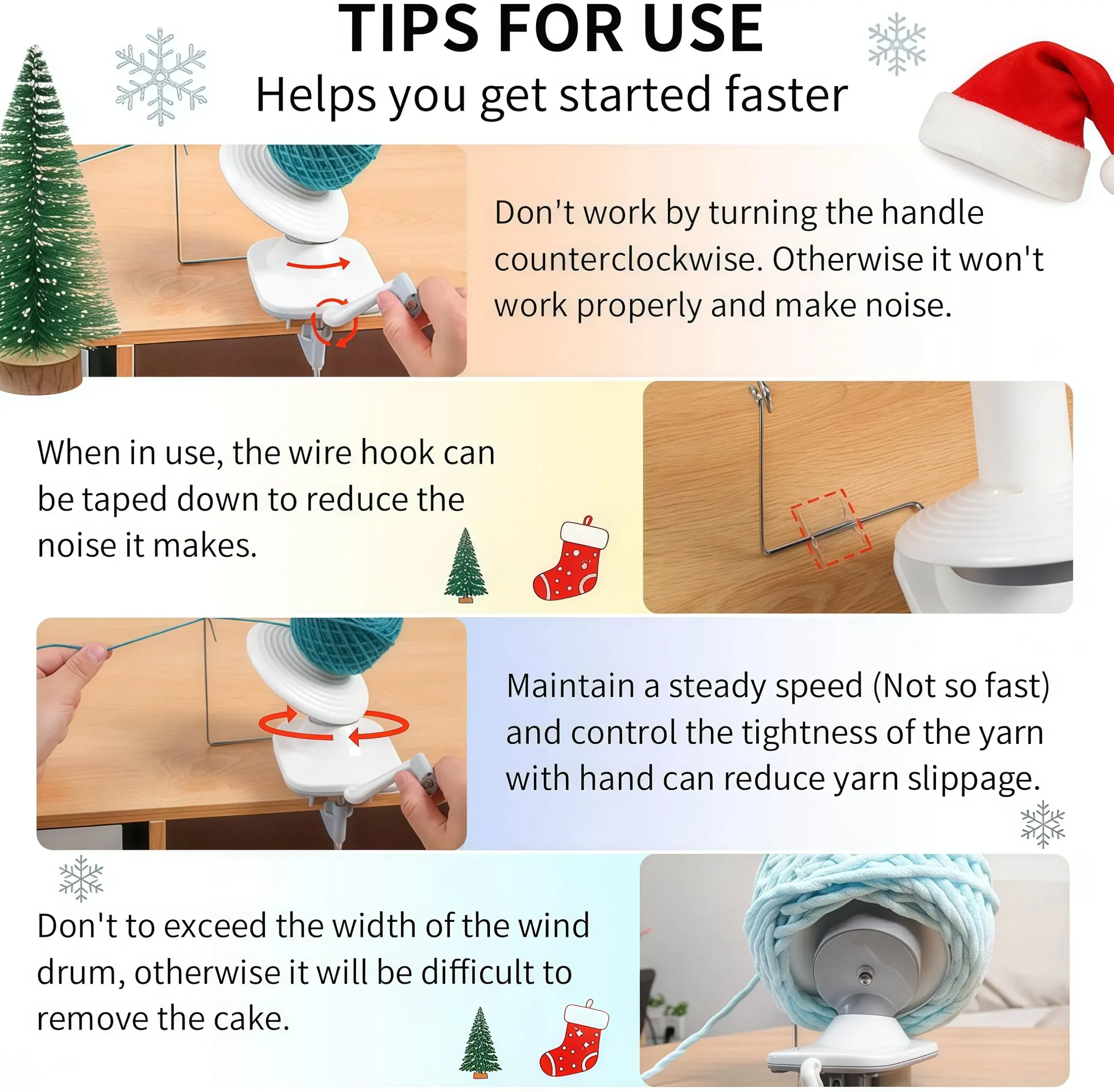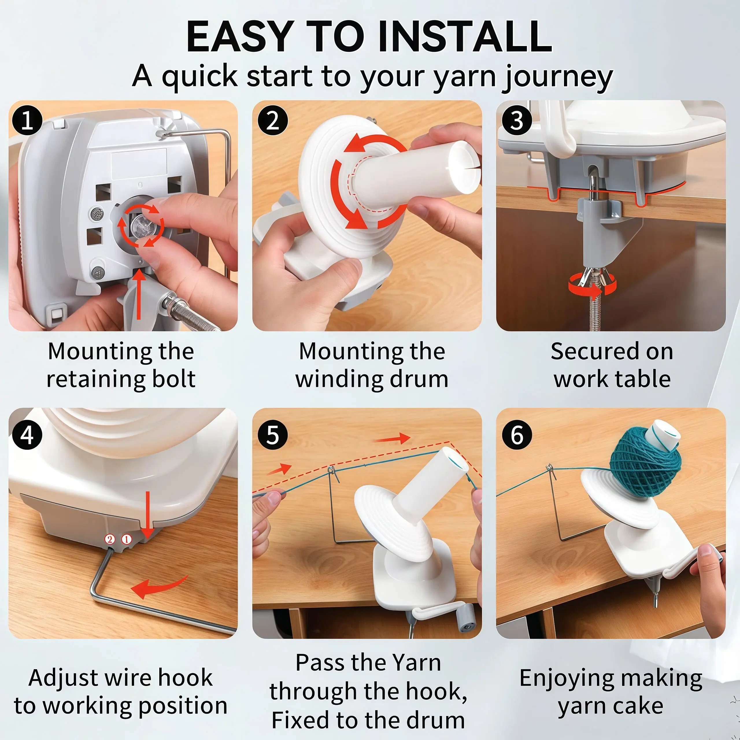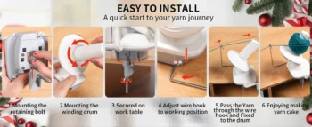 - 【Easy to Install】The yarn ball winder requires only five steps from installation to use, quickly start your knitting journey. Easy to install, reducing your installation woes; Comes with a detailed full-color instruction manual to get you started with the yarn winder faster. Note: It is best with worsted weight yarn (size 4 or less), didn’t work as well with blanket yarn (sixe 6-7)